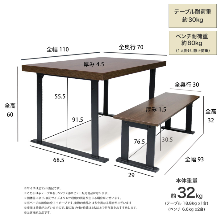 サイズ(ベンチ1台):【全幅】93cm 【奥行】30cm【全高】32cm【重量】6.6kg【耐荷重】80㎏(1人掛け、静止荷重)