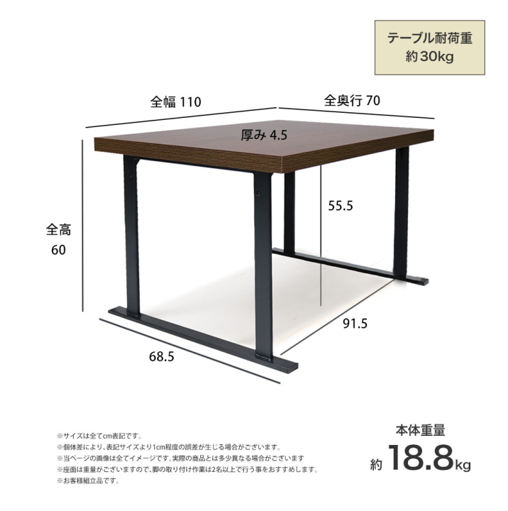 サイズ(テーブル) :【全幅】110cm 【奥行】70cm【全高】60cm【重量】18.8kg【耐荷重】30kg