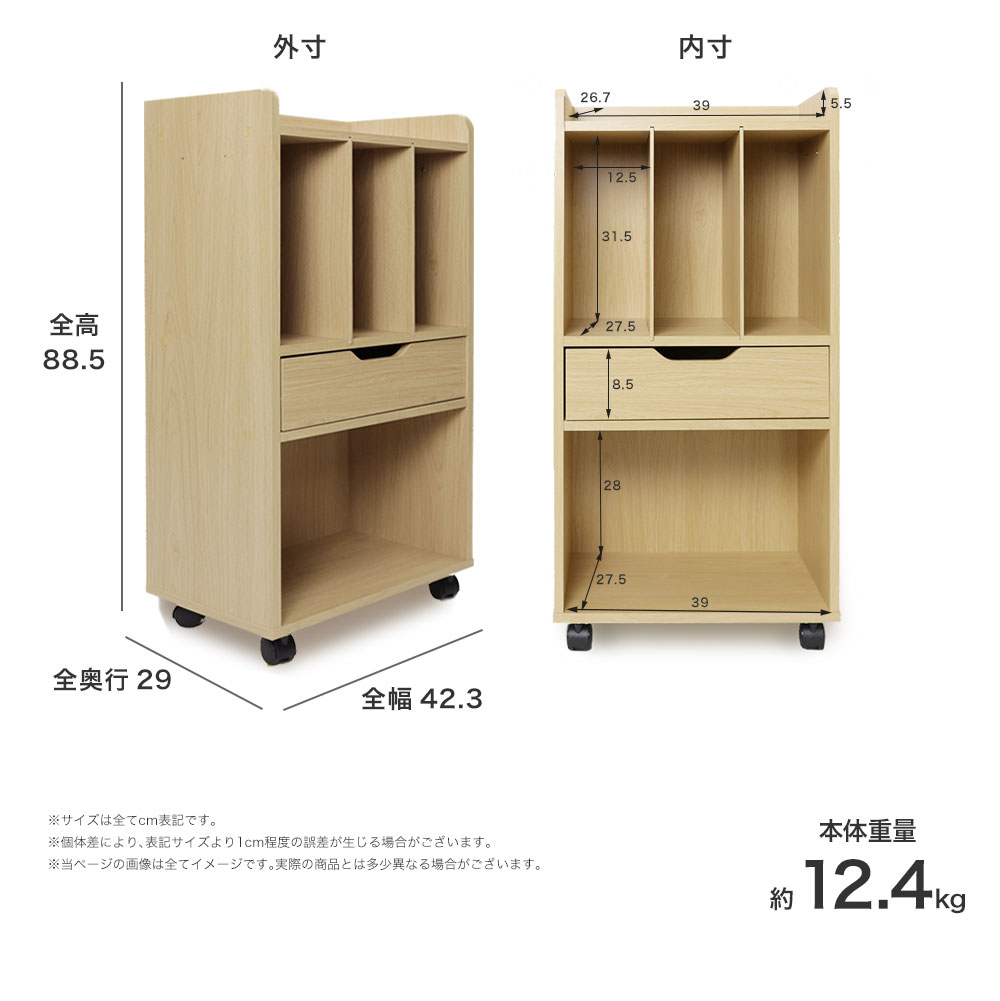 収納力抜群のワイドタイプ。兄弟・姉妹での共有にもぴったりです。ランドセルを置ける天板スペースに加え、教科書やノート、文房具などをすっきり整理できる仕切り棚。側面ハンドルには給食袋や帽子も掛けられます。4つのキャスター付きで、模様替えや掃除の際にも簡単に移動可能。うち2つはストッパー付きで固定もできます。子ども部屋やリビングにも自然に溶け込む、落ち着いた色合いと形。成長しても長く使えるシンプルなデザインです。