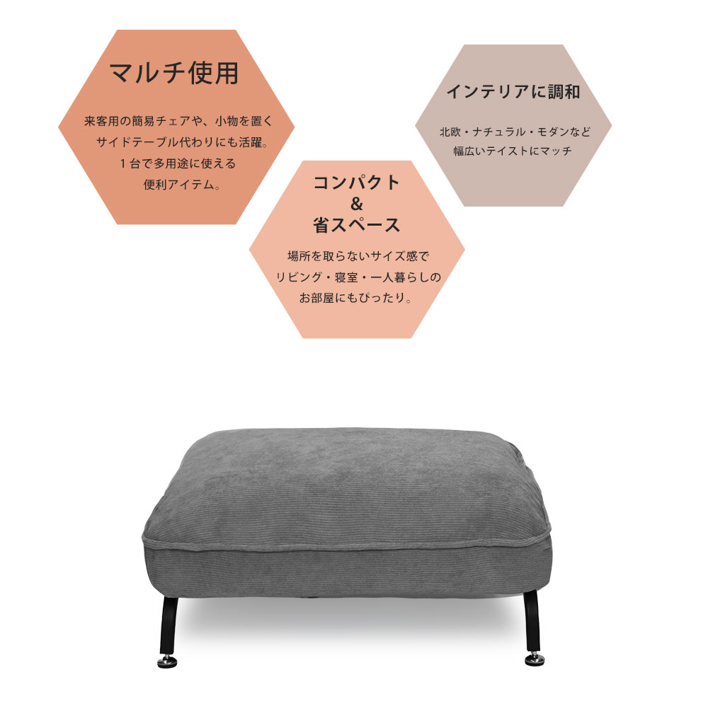 ソファと組み合わせて足置きとして使えば、より快適なリラックスタイムを実現。ソファと同素材を使用し統一感があり、お部屋をおしゃれに演出します。また、来客用の簡易チェアや、小物を置くサイドテーブル代わりにも活躍。1台で多用途に使える便利アイテムです。コンパクトサイズで場所を取らず、和室・洋室問わずさまざまなインテリアにマッチします。長く愛用できる実用性と快適さを兼ね備えています。