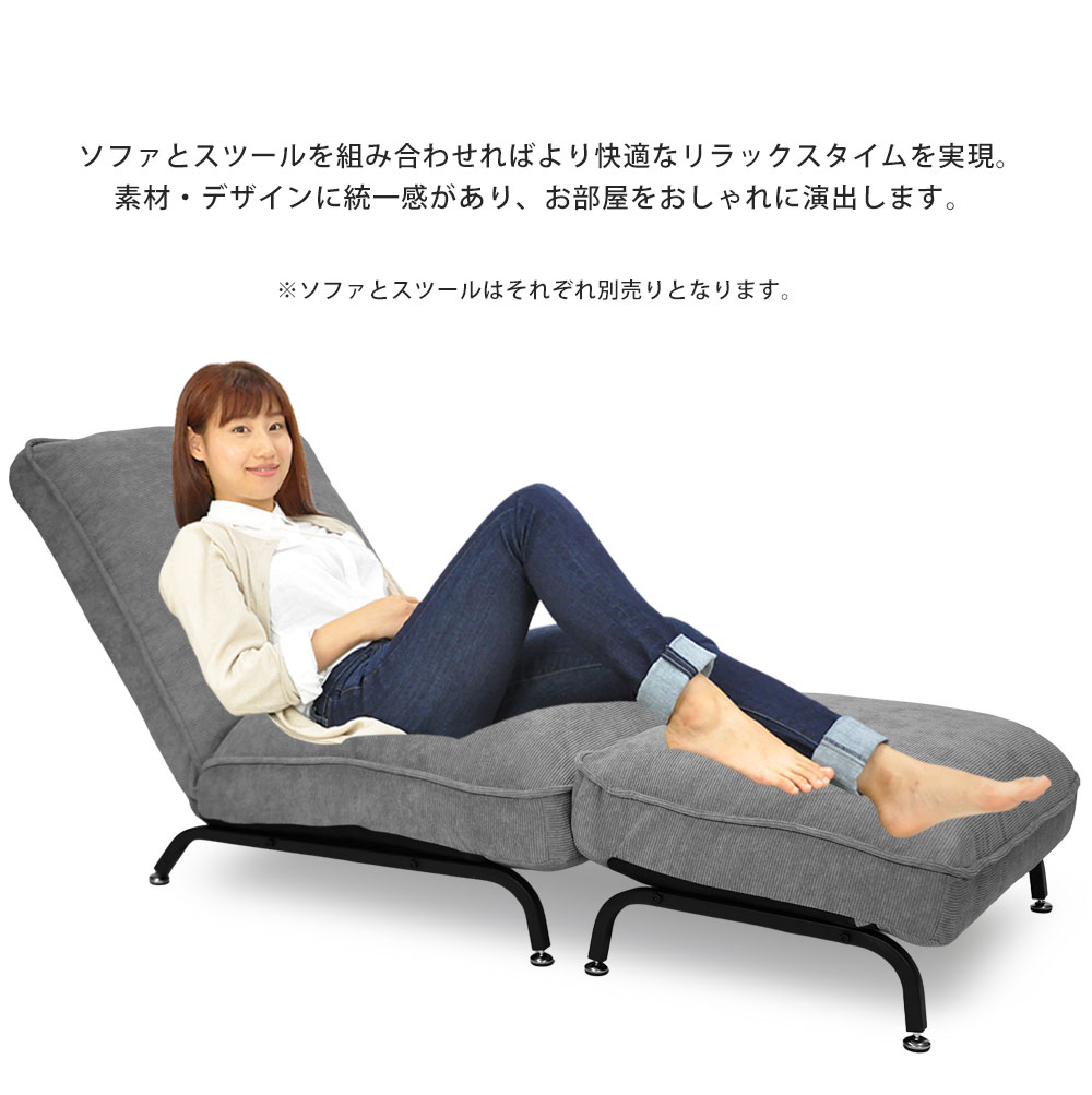 背もたれには KOYO製14段ギアを搭載し、お好みの角度に調整可能。テレビ鑑賞や読書、スマホタイム、ちょっとしたお昼寝までシーンに合わせて自在にリクライニングできます。ソファと同素材のスツール(オットマン)を別売りでご用意しております。足置きとして組み合わせればより快適に、また来客用チェアやサイドテーブル代わりとしても活躍します。落ち着いたデザインで和室・洋室を問わずインテリアに馴染みます。カラーはグレーとブルーの2色展開。お部屋の雰囲気に合わせてコーディネートが可能です。